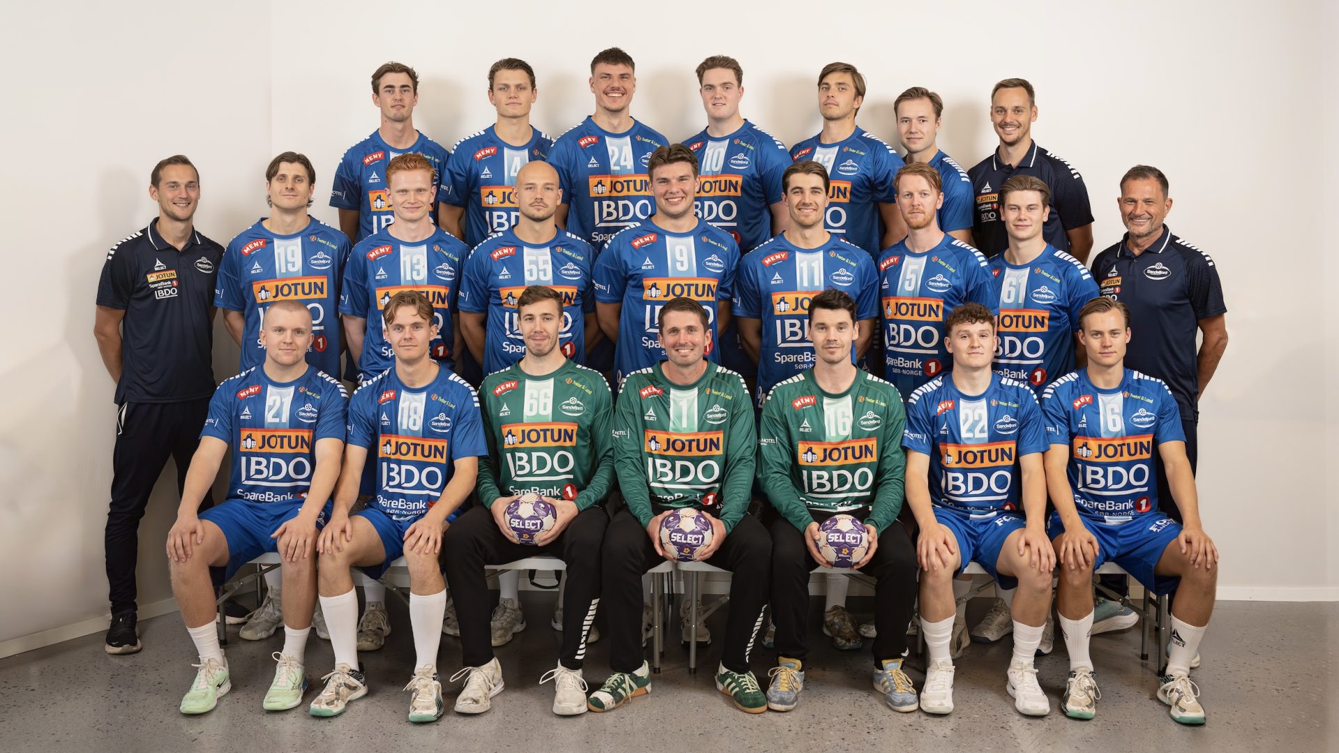 Sandefjords A-lag 2025-26. 1. rekke fra venstre: Sander Tveter, Sivert Løvaas, Phil Döhler, Johan Bergqvist, Benjamin Stentun, Erlend Strand, Sander Rønning. 2. rekke fra venstre: Tobias Skuggedal Hansen (målvakttrener), Gauti Hjalmarsson, Herman Bjørvik, Viktor Hedin, Ørjan Gudmundsen, Sander Wennberg Linderud, Espen Tokerud Røhmer, Kristian Strøm, Marinko Kurtovic (hovedtrener). 3. rekke fra venstre: Endre Svåsand, Christoffer Hartz Hagen, Jakub Petrzela, Simon Føske Danielsen, Anders Jansrud, Victor Iversen, Fredrik Svendsen (ass. trener). Foto: Artur Pardo
